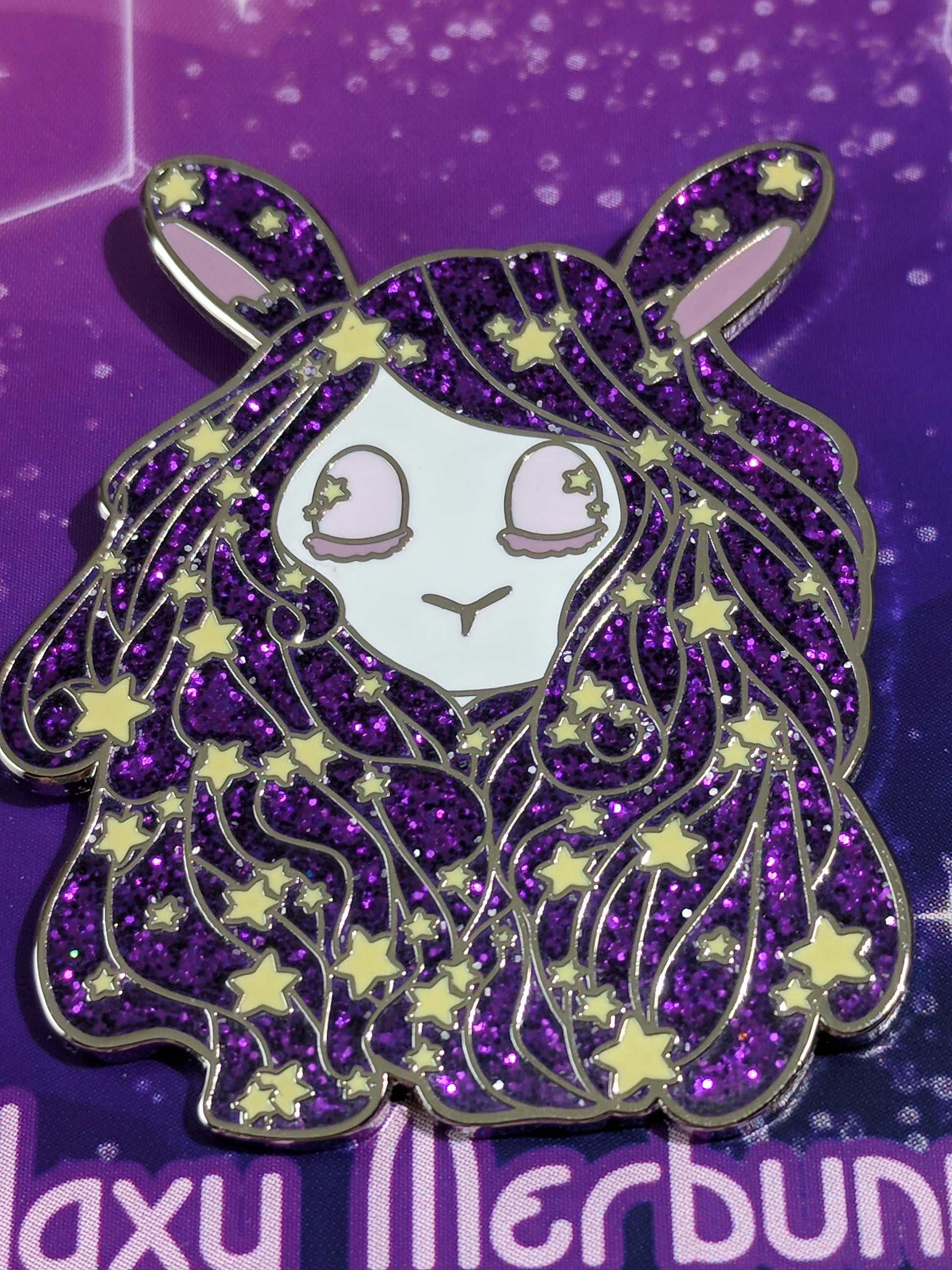 The Galaxy Merbunny Pin is perfect for galaxy and mermaid lovers alike! She is 1.75" and has purple glitter hair