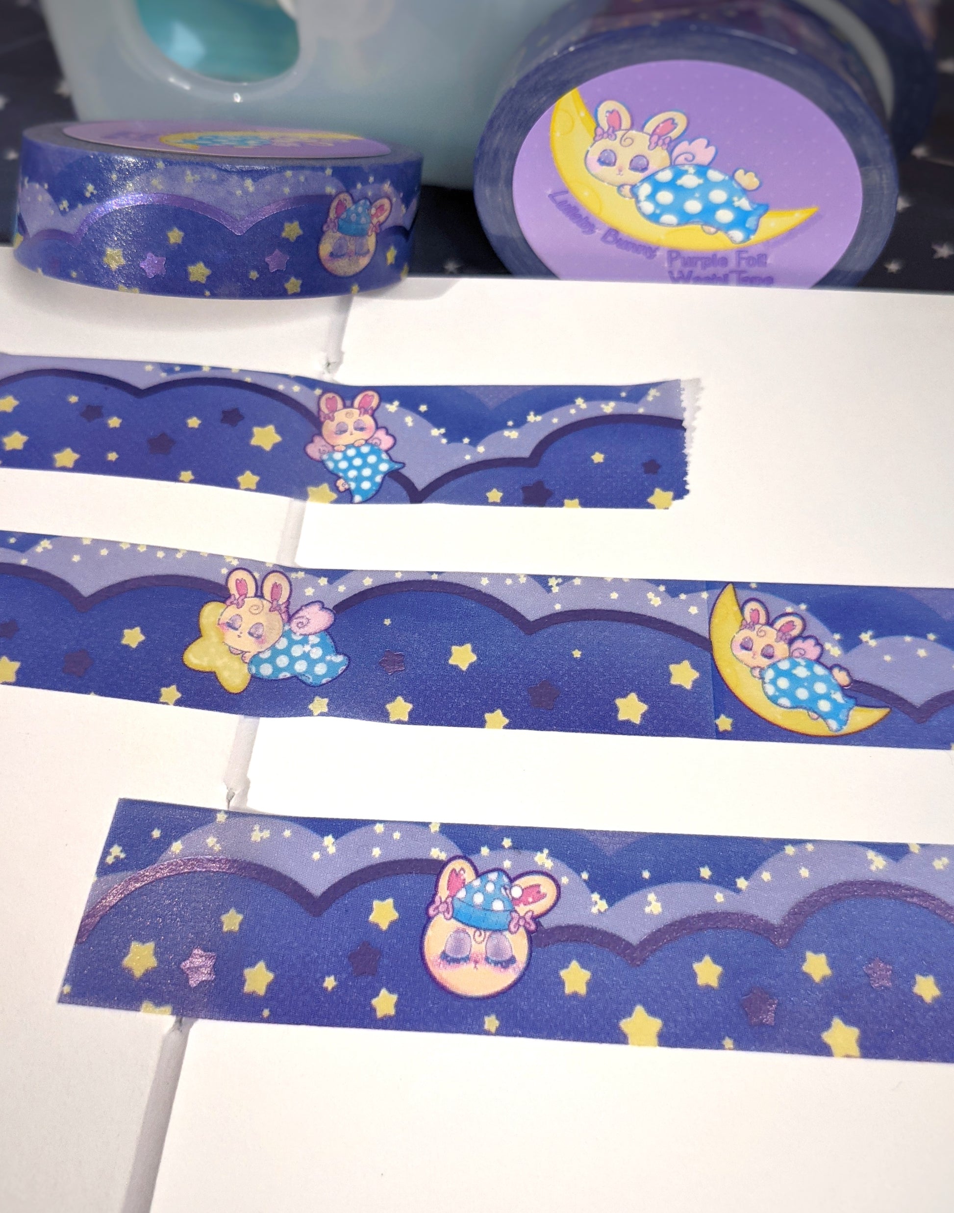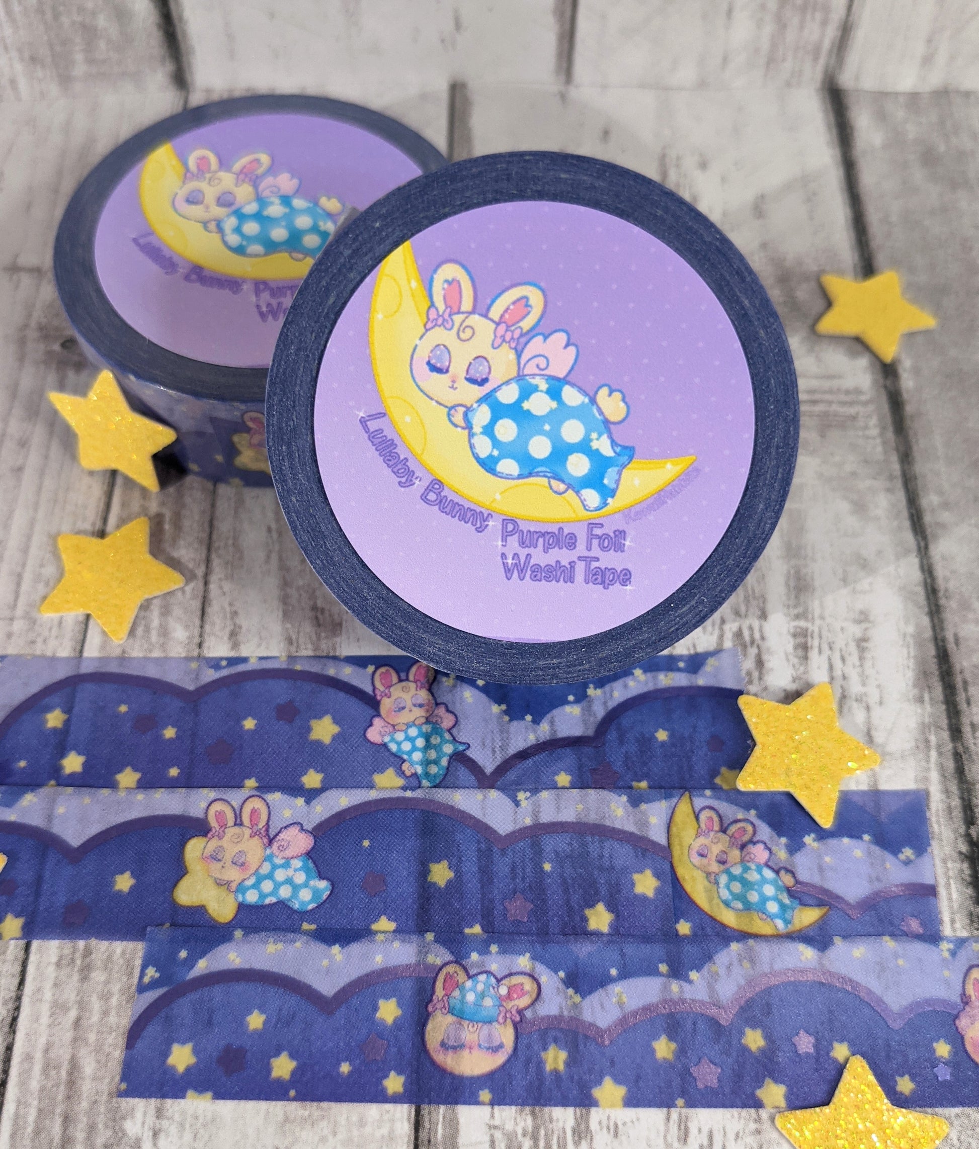 This kawaii washi tape has a purple foil border around a cloud background, and features the lullaby bunny characters!Ā