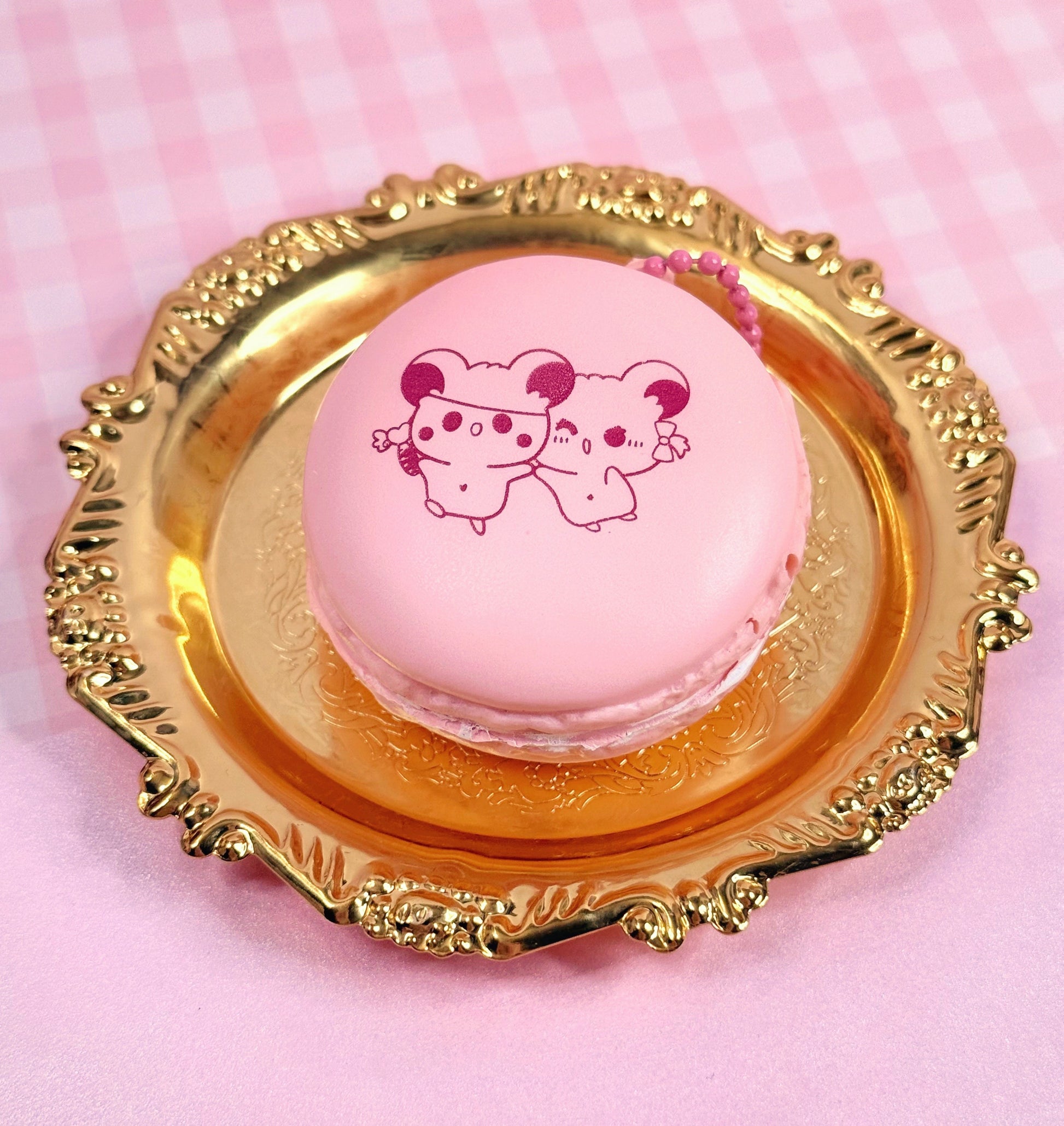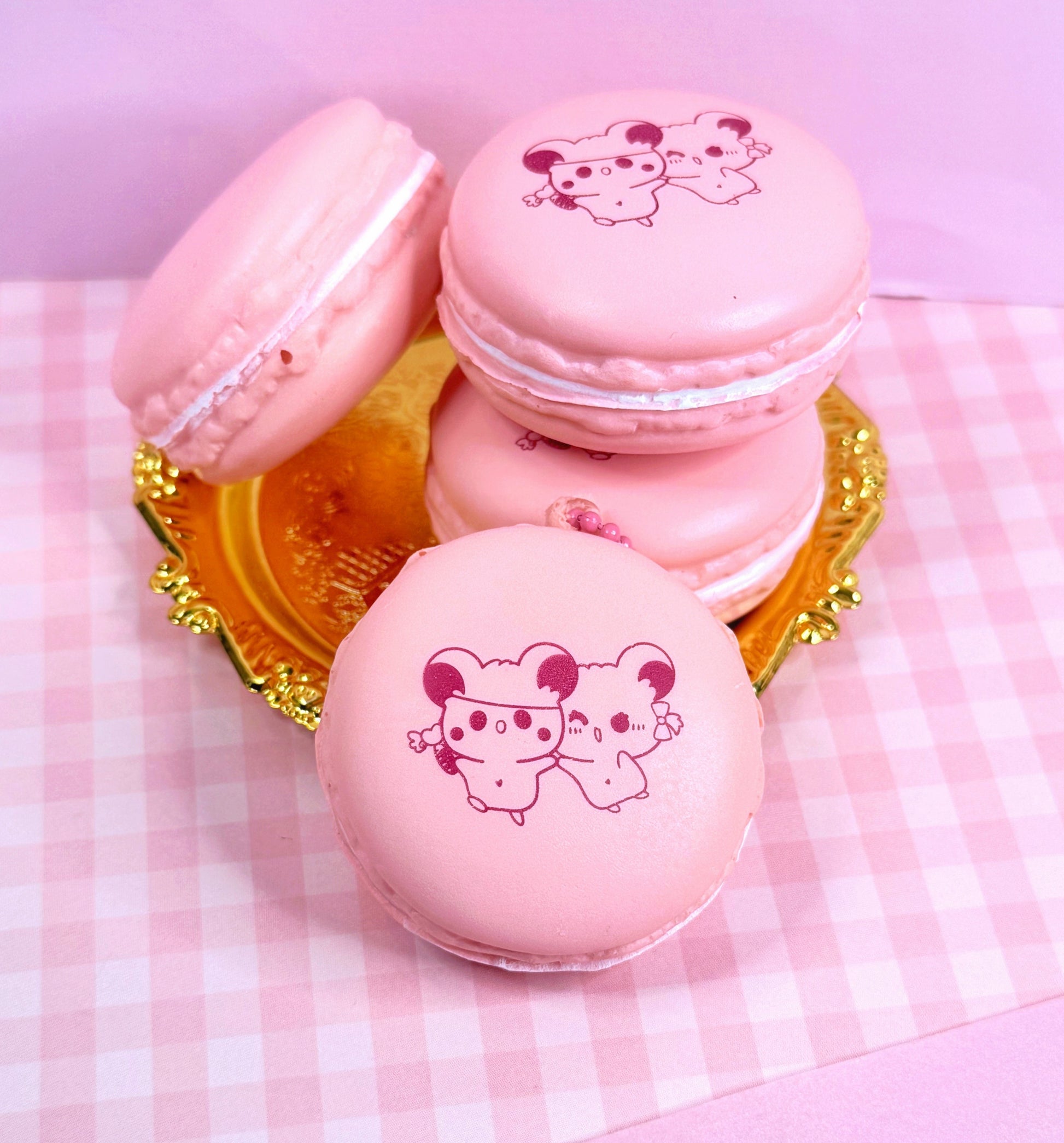 Each macaron has a laser printed image on the top and a little attachment for keychains!