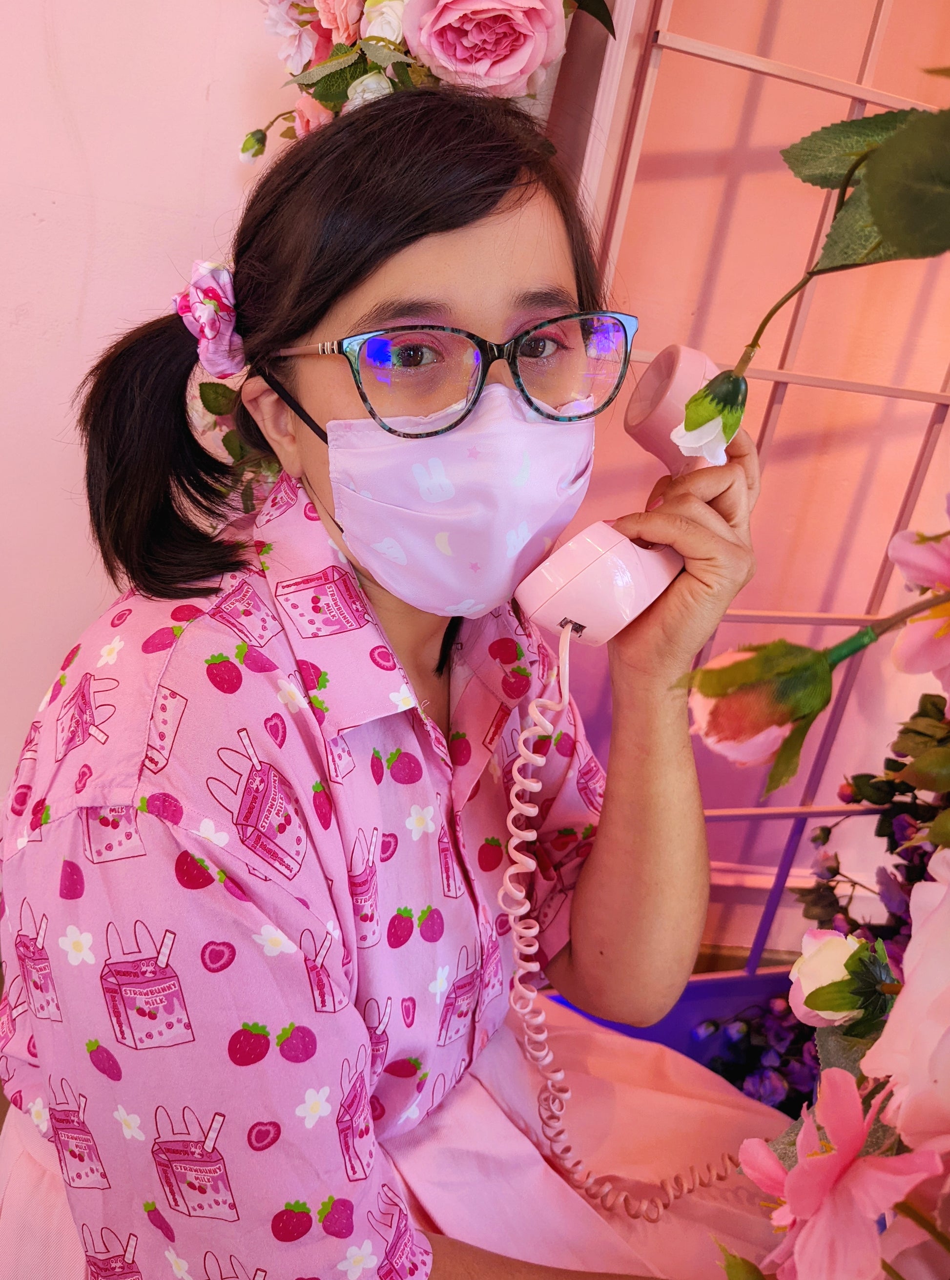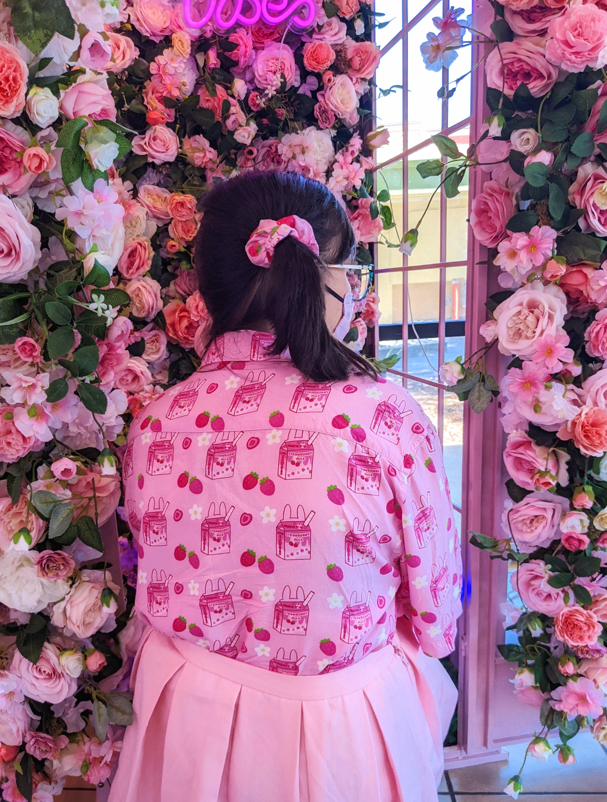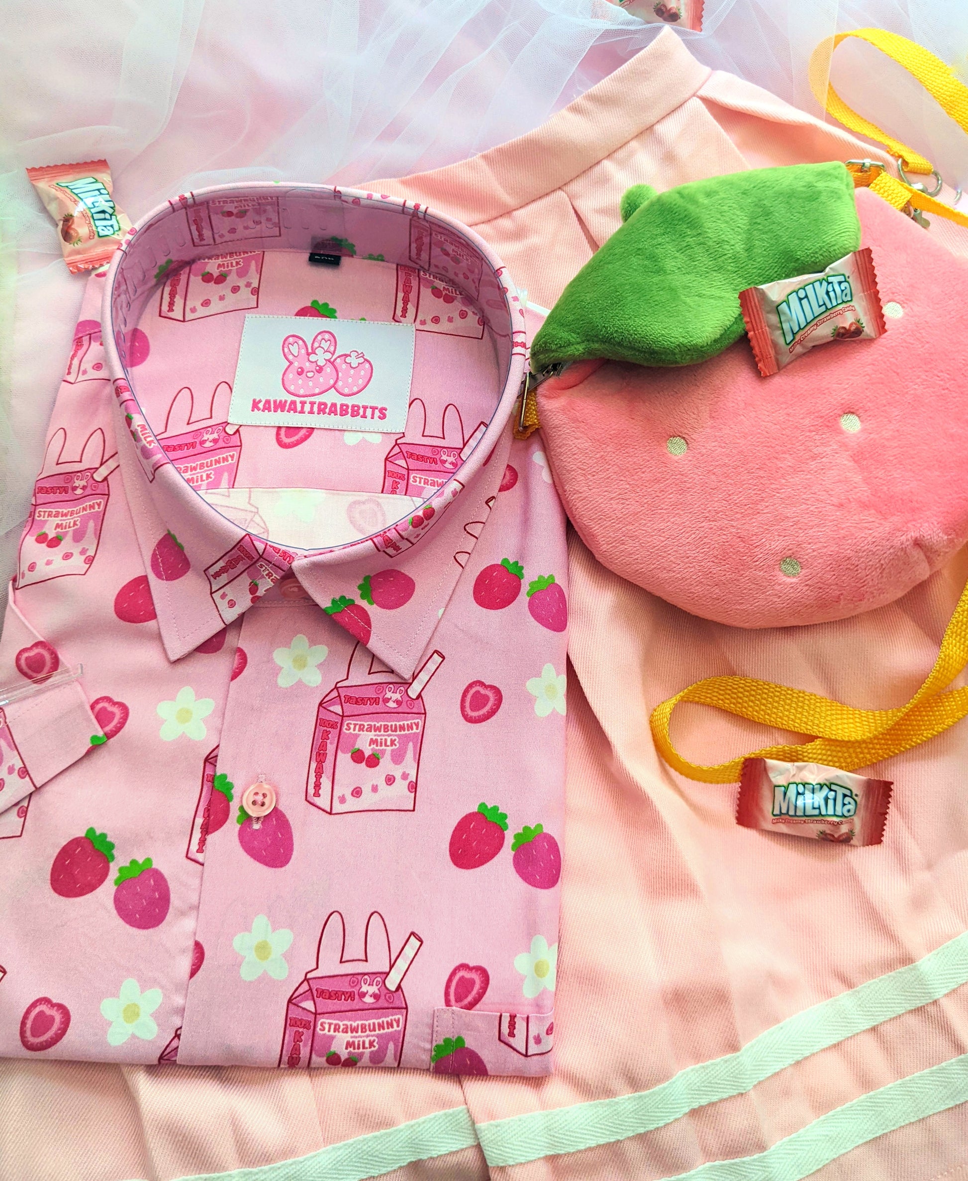 Features a repeating pattern with my updated strawbunny milk design, cute strawberries, and white flowers!
