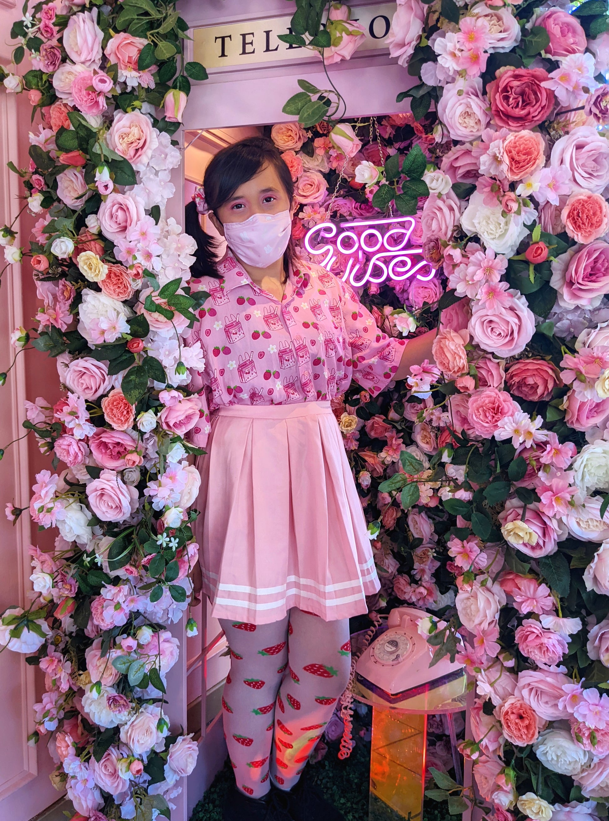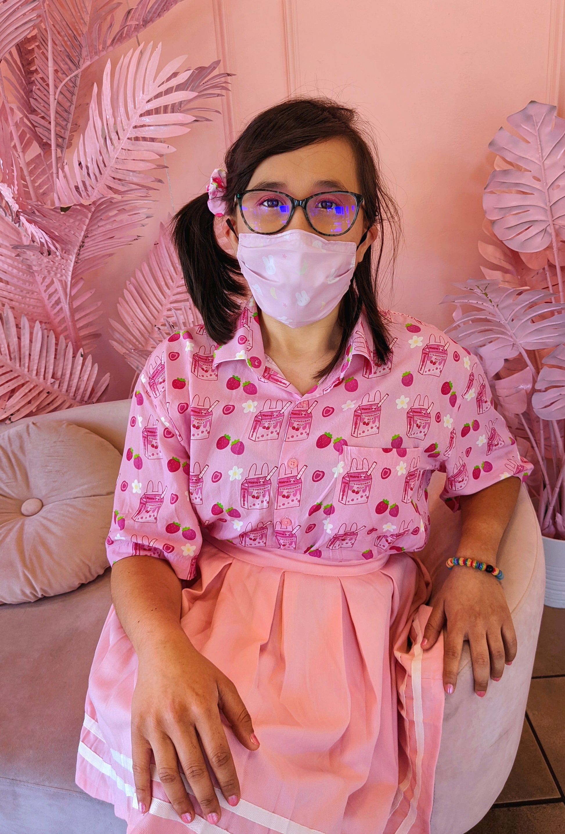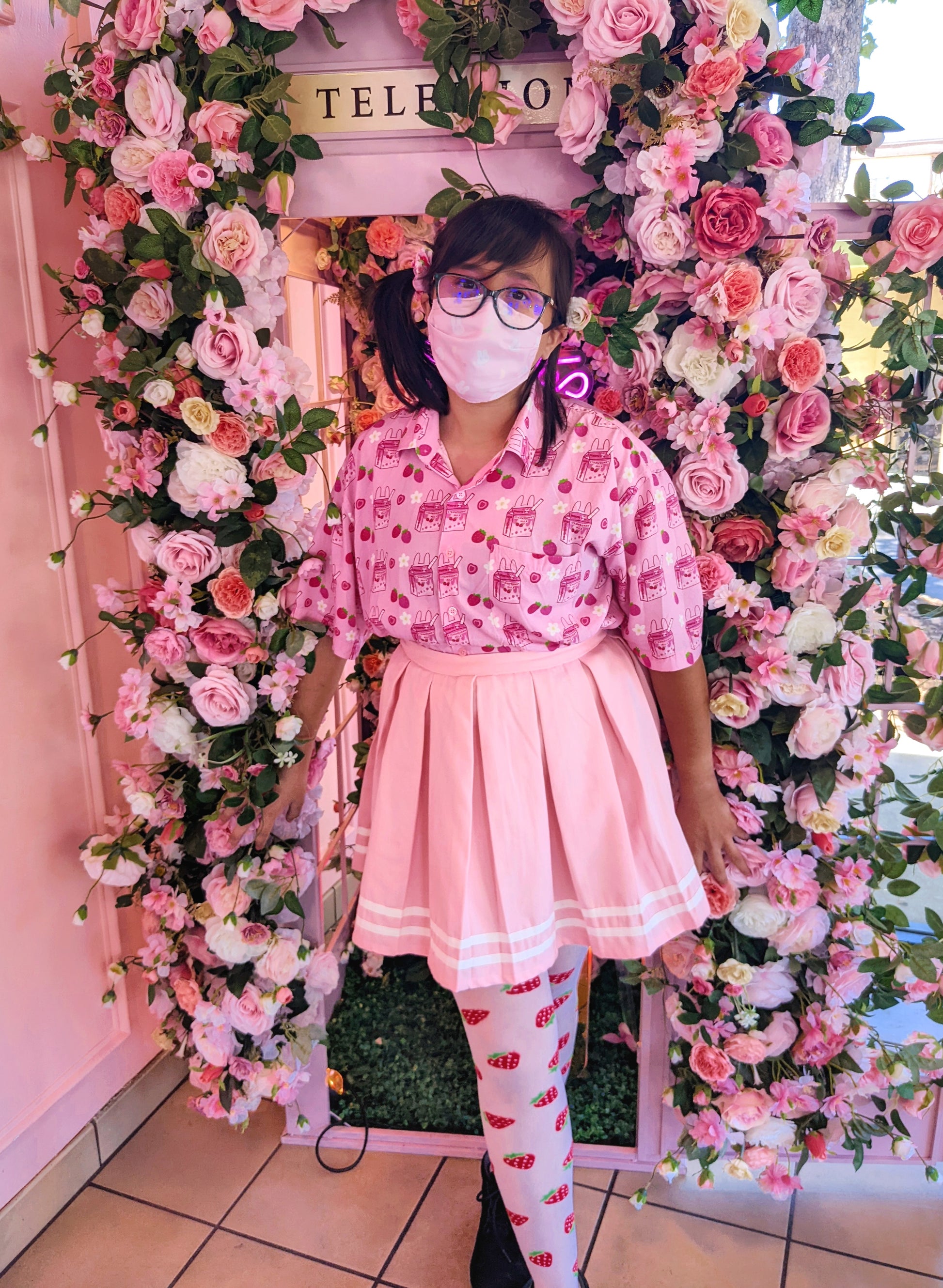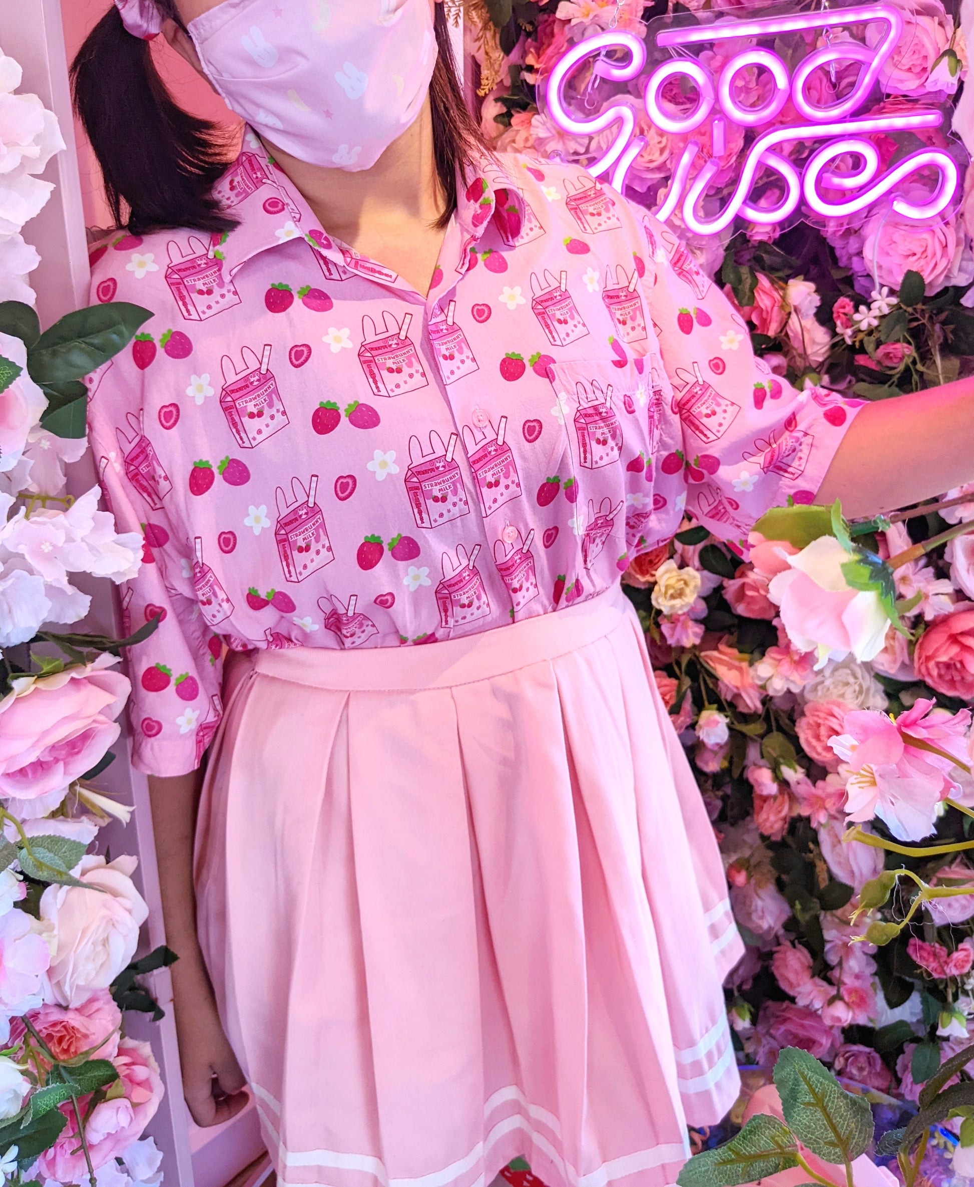 Features a repeating pattern with my updated strawbunny milk design, cute strawberries, and white flowers!